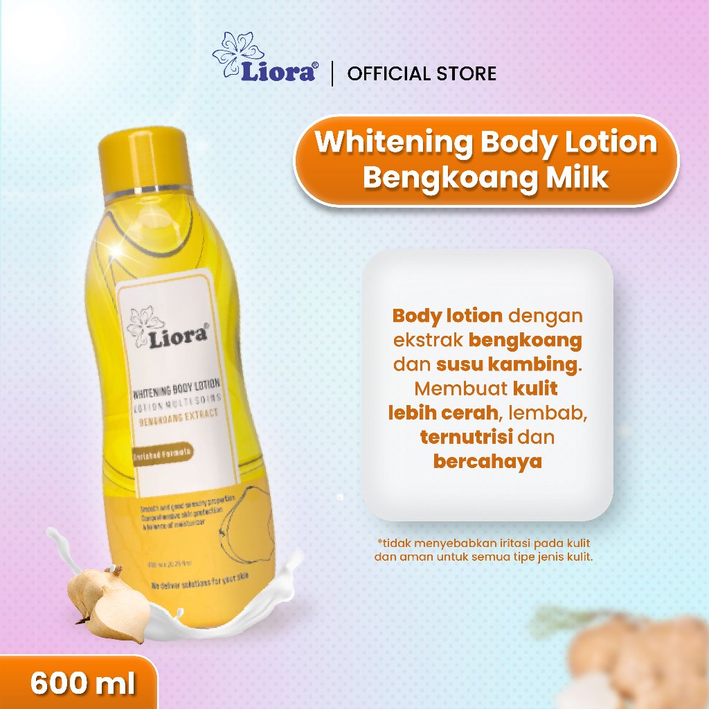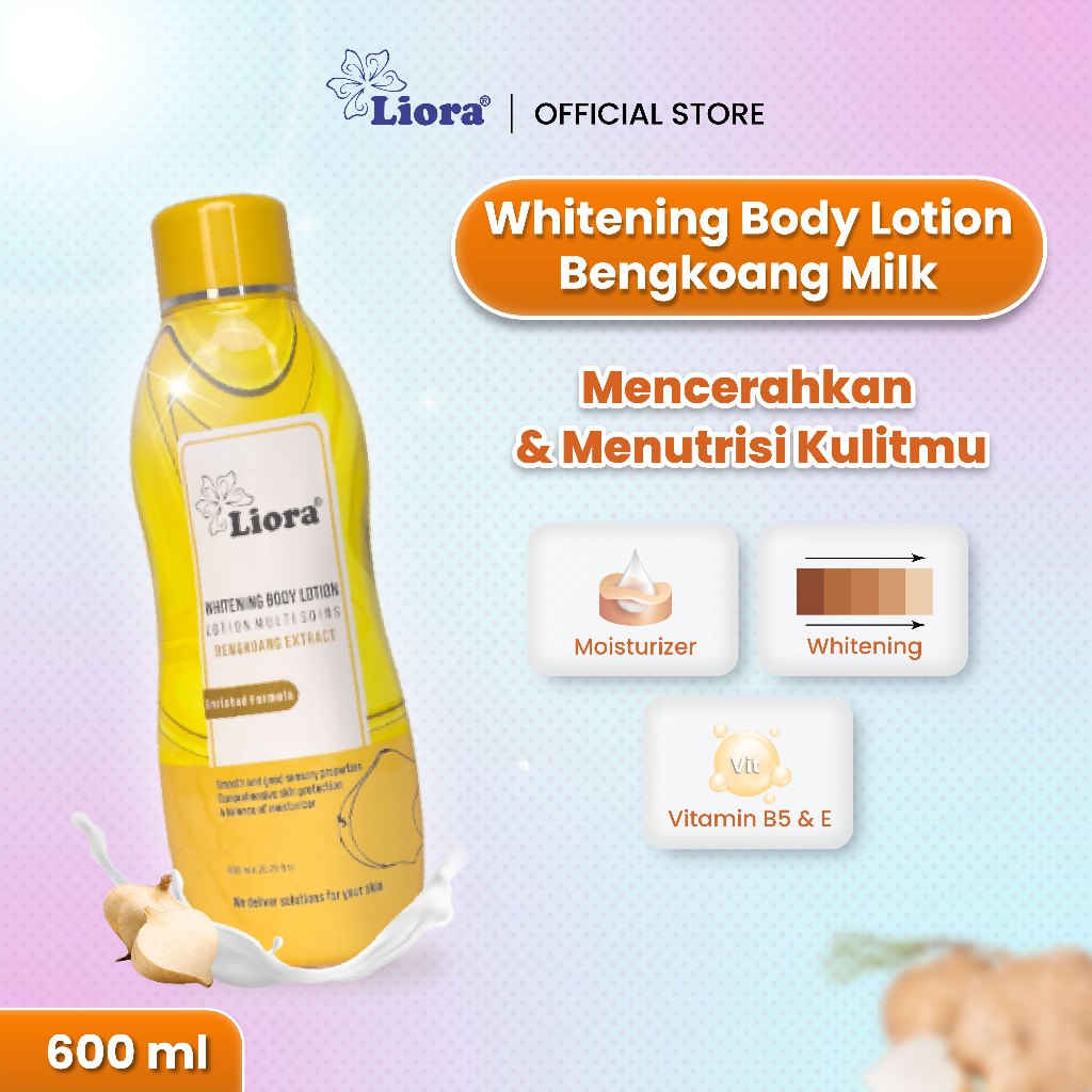 Liora Whitening Body Lotion (Bengkoang Extract) merupakan lotion dengan bahan aktif dari Sari Bengkoang dan Whitening yang berfungsi membuat kulit tampak lebih putih dan cerah. Kandungan Moisturizer menjadikan kulit senantiasa halus, tidak kering, dan tetap lembut. Dilengkapi Vitamin yang memberikan nutrisi pada kulit. Hasilnya kulit tampak lebih putih, halus, segar dan elastis.